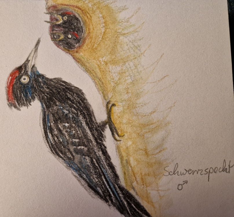 Diesen Monat habe ich mir schwerpunktmäßig den größten heimischen Specht für mein Jahresprojekt rausgesucht. Krähengroß, pechschwarz mit roter Mütze und einem sehr zurückgezogen Leben und auch noch eine Schlüsselart in unseren Wäldern, das ist der Schwarzspecht.
