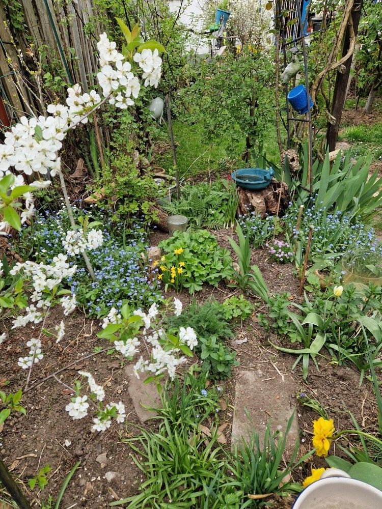 Gut verpackt, keine Schäden und gesunde, gute PflanzenStandortüberlegungen im Sonnenbeet mit rötlichen und weiße Blumen, wobei jetzt erstenmal das blaue Männertreu überall blüht, welches sich selbst ausgesät hat. Kaum sichtbar, 2 neue Pflanzen, der Topf mit Holzwolle ist Unterschlupf für Nutzinsekten (links der Kompost, daher liegt dort Drahtgeflecht)Sichtachse