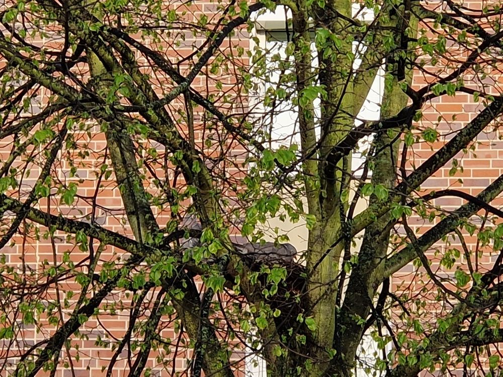 Ich liebe diesen Dunst über der Erde! Auf dem Rückweg entdecke ich ein Taubenpärchen, sie sitzt brütend oder Ei ablegend auf dem Nest im Baum.