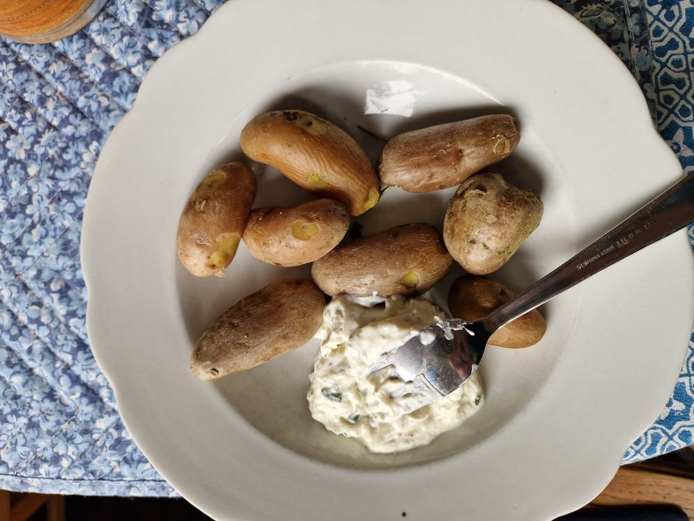 Abendessen, Pellkartoffeln von gestern mit Kräuterquark, fix per Mikrowelle erhitzt, immer noch lecker