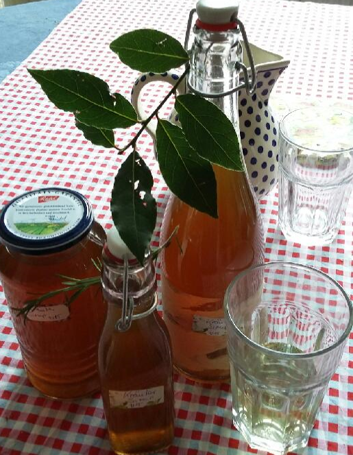 Dann hatte ich schon den ganzen Sommer vor gehabt, Kräutersirup zu machen. Gestern sollte der letze schöne Tag der Woche werden und so habe ich aus dem Garten Pfefferminze, Melisse, Rosmarin, Ringelblumen, Lavendel, Thymian und sogar etwas Bohnenkraut gesammelt. Mit ca. zwei Hand voll Kräutern aus dem Garten und etwas Zitronengras aus dem Laden habe ich dann 1,5 Liter kochendes Wasser im grossen Topf die Nacht über ziehen lassen. Heute Morgen wurden das Kraut dann abgeseiht und den Aufguss habe ich mit 1kg Zucker, (Rohrohrzucker mag ich da am liebsten,) erhitzt. Schnell die Flaschen desinfiziert und als sich der Zucker ganz aufgelöst hatte und der Sirup fast kochte, mit einem Trichter umgefüllt. Durch den hohen Zuckeranteil hält sich der Sirup noch bis in den Winter. „Dummerweise“ mögen ihn meine Kinder sehr gern und ich werde wohl noch mal so viel machen müssen. Übrigens, die Pfefferminze ist das stärkste ätherische Öl und kommt entsprechend durch. Probiert einfach Eure Zusammenstellungen aus.