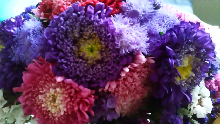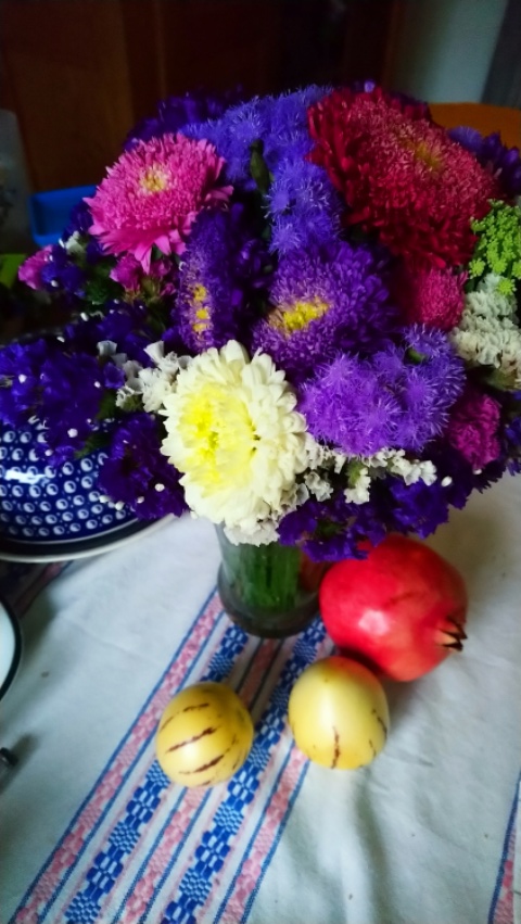 Herbstblumen erhellen mit ihren bunten Farben unseren Tisch. So habe ich seit langem wieder einen Strauß, den ich bei Holunderblütchen zeigen kann und mag.