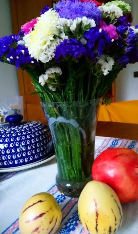 Mit Herbstblumen und ungewöhnlichen Früchten. Die Melonenbirne auf dem Bild sind tatsächlich aus meinem Garten. Ein Nachtschattengewächs, ursprünglich aus Südamerika. Sehr lecker, melonig-gurkig-birnig. Die Pflanze ist einfach durch einen abgeschnittenen Ast im Wasser (Wurzelbildung) zu vermehren. Jetzt will sie, ab nahendem Frost, bald in einen kühlen, hellen Innenraum. Dort können übrigens Früchte, die noch dran hängen, durchaus zu Ende reifen, regelmäßige Wassergaben nicht vergessen.