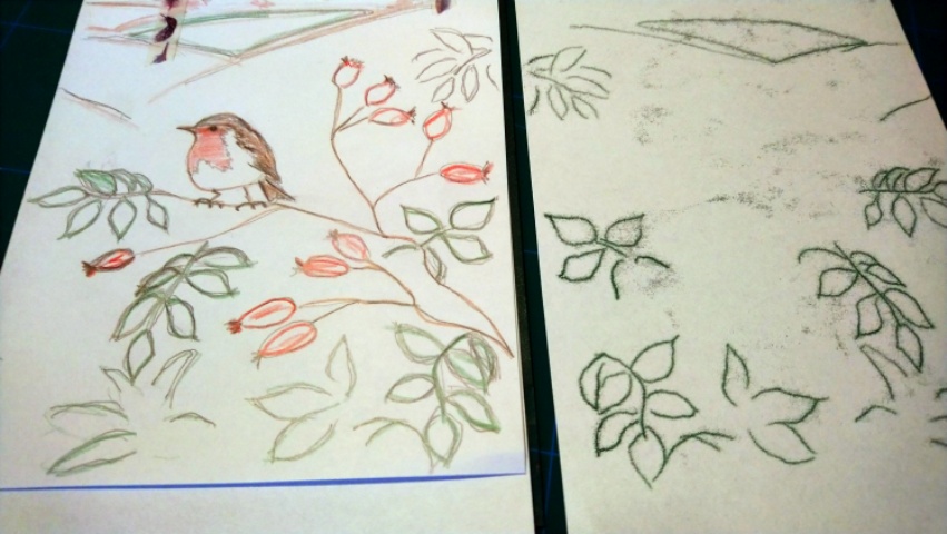 Einmal Farbe auf die Platte, Blancoblatt und Bild, Motiv nachfahren, hochheben, neue Farbe auftragen…