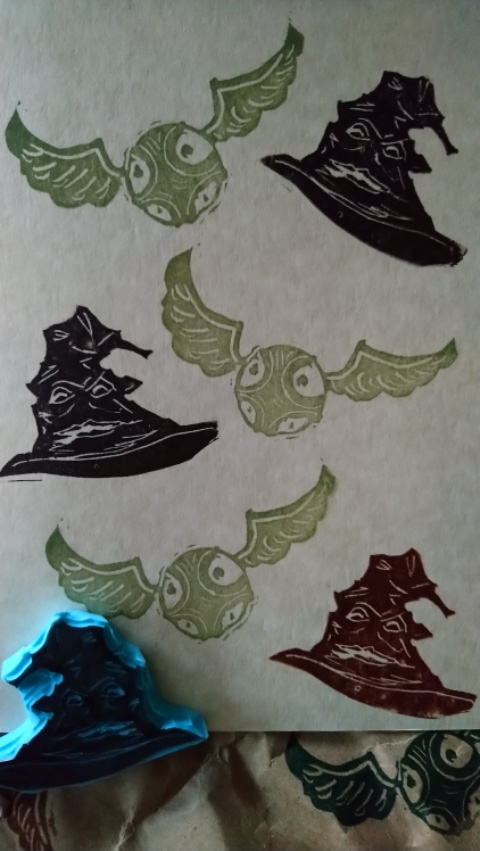 Es wurden ansonsten zwei Motive aus den Harry Potter Geschichten geschnitzt und gestempelt, der goldene Schnatz und der sprechende Hut. So entstand eine Glückwunschkarte und Geschenkpapier für einen Fan.