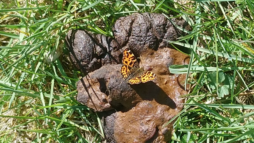 Ja, es werden noch fleißig Nährstoffen aus den Hinterlassenschaften gesaugt. Aber im ersten Moment ist es doch ein krasser Gegensatz, unsere Erwartung sagt uns, dass der Schmetterling doch Nektar saugt.