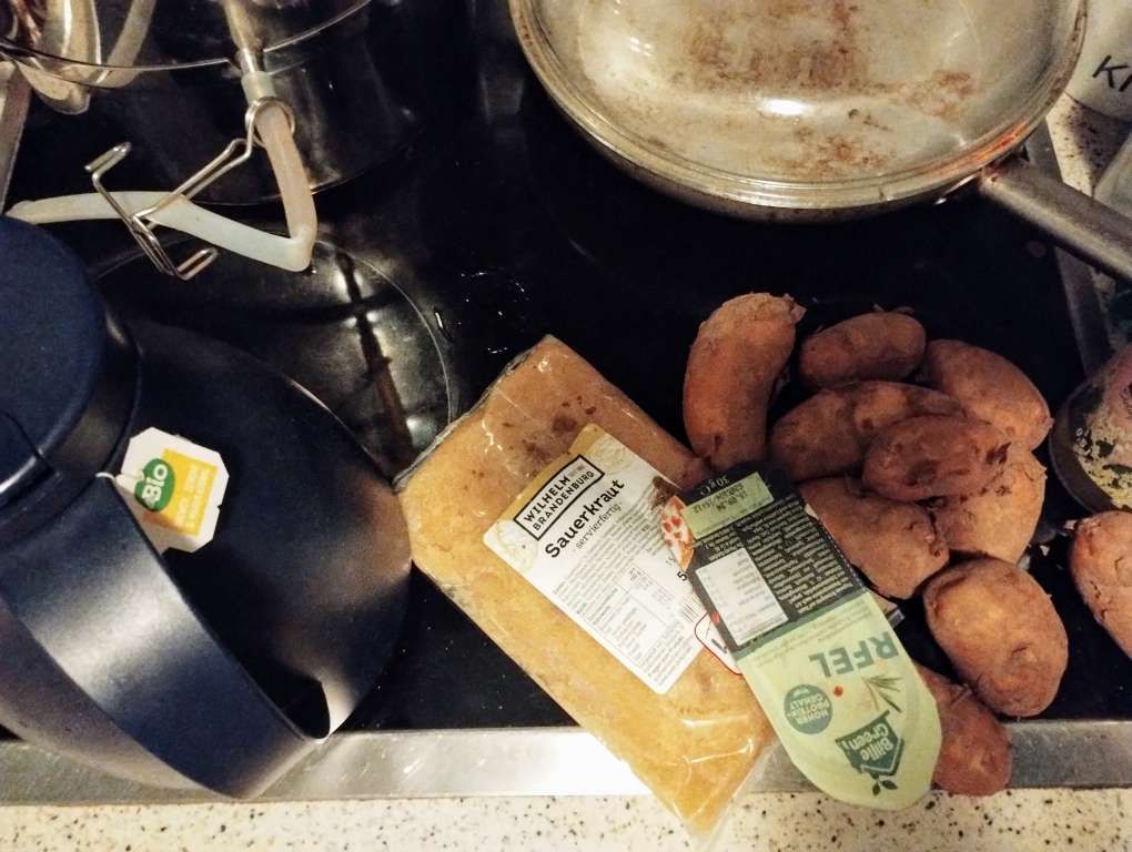 Ich mache mir gleich eine Kanne Tee und lege für das Mittagessen raus, was ich geplant habe. Links steht der Entsafter. Über Nacht habe ich die Äpfel noch „abtropfen“ lassen. Das soll Gelee geben. Aber später (und da ich die Kartoffeln nicht gut schälen kann, werden es Schupfnudeln und der Sohn macht sie)
