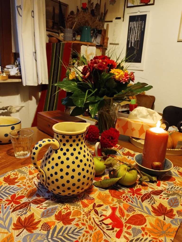 Ich mag deine herbstliche Tischdecke sehr! Und so schön die Blumen mit der kurzen Anreise.