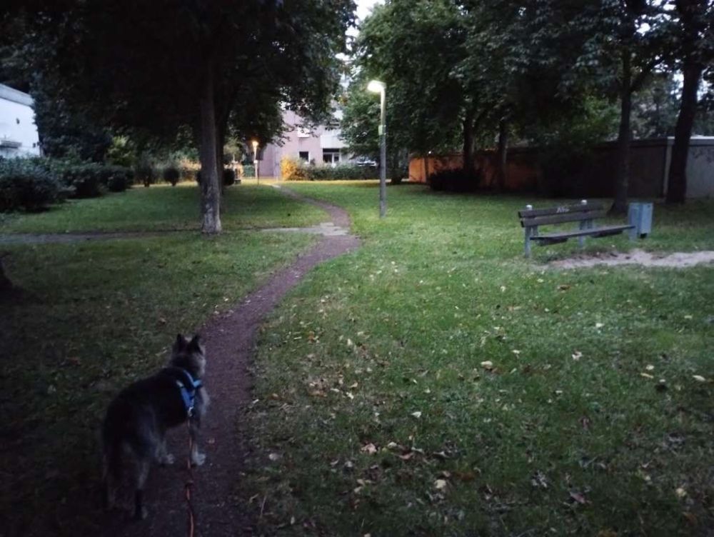 Hundegang im fast noch Dunkeln. Das Handy macht es heller als es war. Und es fallen wieder erste Regentropfen. Der Wechsel zwischen Hochsommer über 30° auf jetzt regnerisch 8°C ist echt heftig.