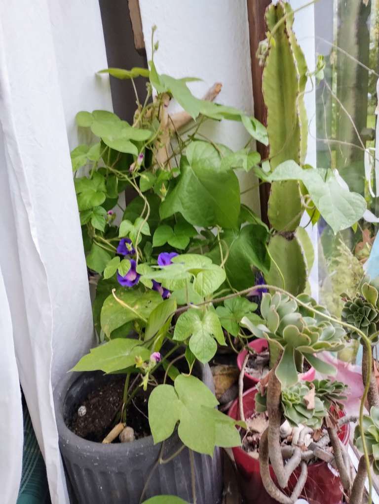 Blumen auf der Fensterbank gießen. Es hatte sich tatsächlich eine Prunkwinde ausgesät. Eigentlich ist in dem Topf Ingwer.