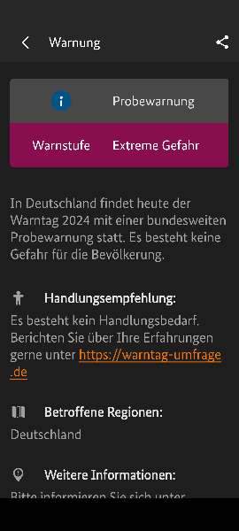 erst einmal wünsche dir gute Besserung. Mir ging das ähnlich, ich hatte gestern im Radio vom Warntag gehört und als es dann soweit war, total erschrocken.