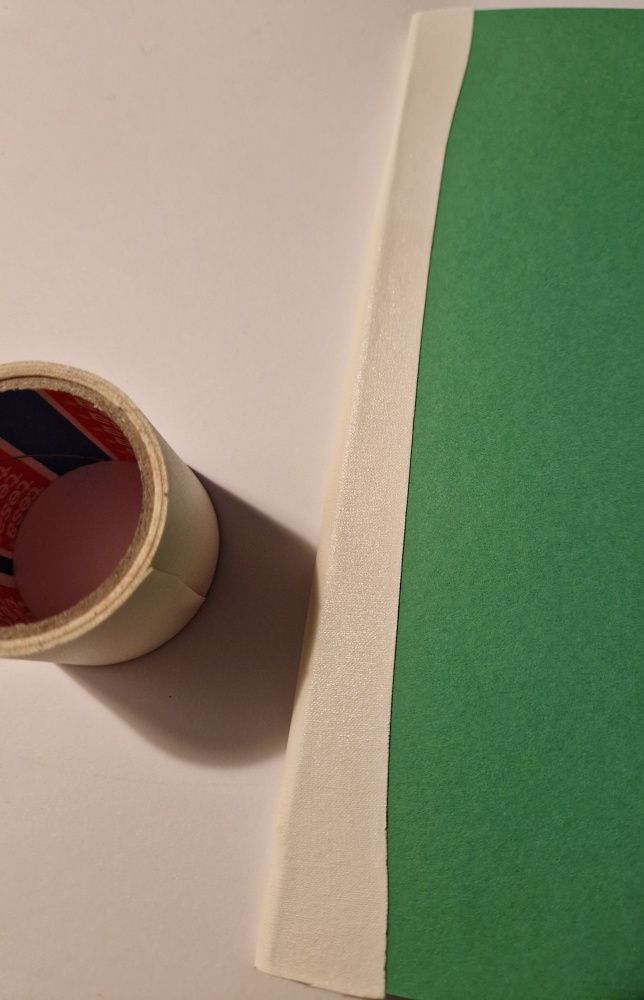 Zum Schluß wird diese bündige Seite mit einem Klebeband zusammengefaßt. Solltet Ihr nicht so ein Buchbinderklebeband haben, geht auch ein Stück angepasstes Papier. (Flexibler ist aber das textile Klebeband)