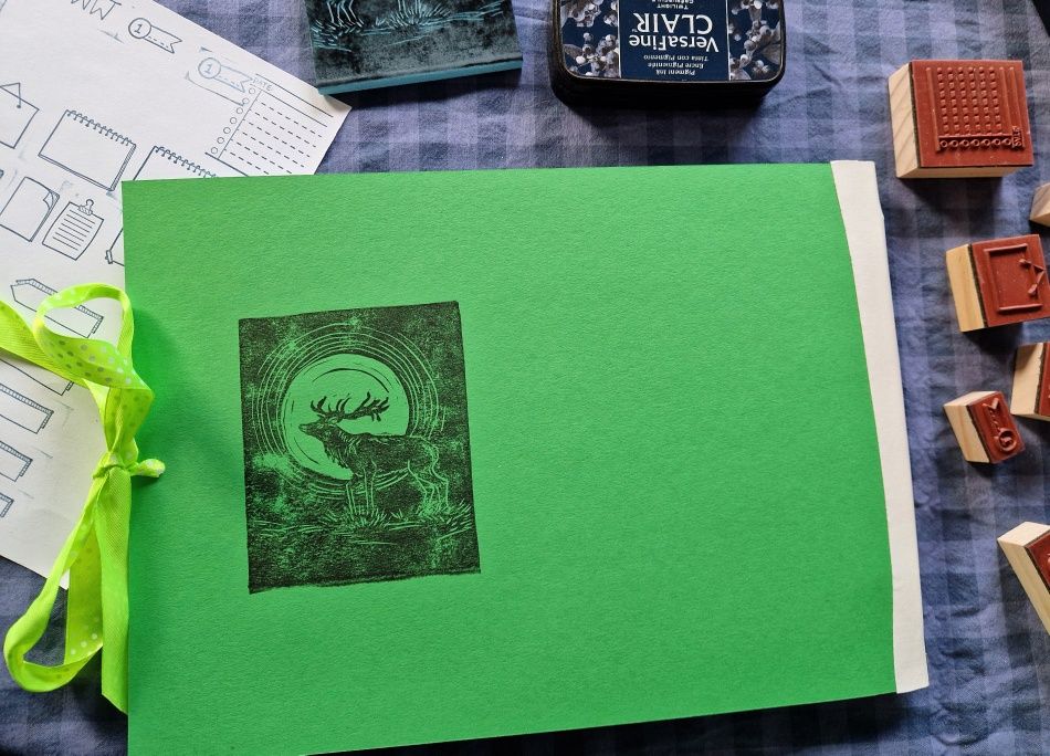Ich habe einen großen Schulmalblock genommen, ein kleiner tut es natürlich auch, (DinA4/5) oder Zeitungspapier, oder buntes oder… Für außen habe ich grünen Tonkarton ausgewählt. Sehr schön ist aber auch dicke Pappe, egal ob Ihr zB die graue Pappe des Schulblocks in der Mitte teilt oder braunen Karton zurecht schneidet, es gibt dem Folder die Stabilität. Wenn Ihr mögt, könnt Ihr die Außenkartons auch gestalten und/oder beschriften. Das ist ganz Eurer Fantasie überlassen.