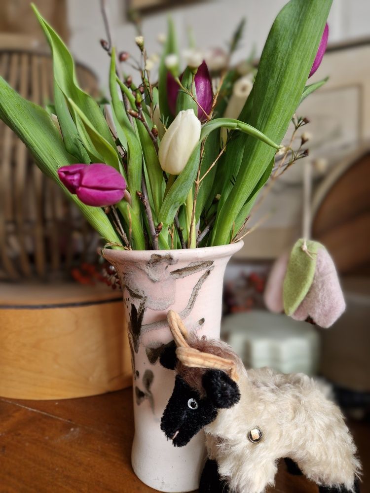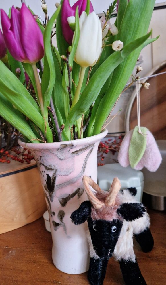 Neben letzten Stichen am Kostüm des „Wassermann“ habe ich viel Textiles repariert, meist per Hand: Leder, Wolle, Baumwolle und hab von allem keine Fotos 😅, genau wie von zwei Geburtstagsgeschenken. Aber endlich wieder einen Strauß: zweierlei Tulpen in meiner rosa Vase, mit Wachsblümchen, Kirschzweigen und etwas Deko, etwas Rosa für niwibo sucht. Eigentlich wollte auch ich rosa Tulpen, aber es gab nirgends welche gestern. Na, Violett und Weiß würde Rosa ergeben und gefällt mir auch in der schwarz-rosa Vase.