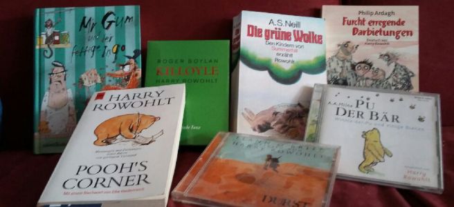 Schon als Teenager habe ich in der Wochenzeitung „Die Zeit“ seine Kolumne gelesen und gerne dann noch mal als Sammlung in Buchform: „Pooh`s corner„. Das Bilderbuch „Ich, Kater Robinson“ handelt von einem Kater, der sich im Mittelpunkt der Welt sieht und dabei immer einen auf`s Fell bekommt, bis…, ich mag es sehr und bekam es in meiner Ausbildung von einer lieben Freundin geschenkt. Seine Hörbücher von Winnie dem Pooh von A.A. Milne sind wunderbar und zeitlos. Er hat sie übersetzt und Pooh, I-Ah, Ferkel und all den anderen Figuren seine rauchige, wandelbare Stimme geliehen. Pu der Bär – wie er im Deutschen heisst, brachte ihm sogar eine goldene Schallplatte ein. Ein Jahr lang schlief unser ältester Sohn mit den *Geschichten um den Bären von geringem Verstand* ein. Auch seine vielen anderen Kinder – und Jugendbuchübersetzungen sind grandios. Schon sehr früh machte sich Rowohlt einen Namen als Übersetzer, als er das Kinder- und Jugendbuch „Diegrüne Wolke“ von A.S. Neill übersetze. Dieses Buch schaffte es als erstes Kinderbuch auf die Spiegelbestenliste. Gott sei Dank brachte Harry Rowohlt noch so manches gute Kinder- und Jugendbuch vom Englischen in`s Deutsche, so z. B. die lustige Reihe um „Mr. Gum“ von Andy Stanton, oder viele tolle, schräge Bücher von Philip Ardagh. So manches dieser guten Kinder- und Jugendbücher wird auch gern von Erwachsenen gelesen. Sie zeichnen sich vor allen Dingen durch Wortwitz und Einfallsreichtum aus, den hat H. Rowohlt so gut übertragen. Dem Klassiker von Kenneth Graham „Der Wind in den Weiden“ schenkte er eine wunderbare, deutsche Übersetzung. Auch hier lieh er den Geschichten oftmals wieder seine Stimme. Als ich das erste mal in Irland war, kam ich nicht an „Flann O`Brien“ vorbei, der von Harry Rowohlt übersetzt wurde. So hatten wir auch das Glück, in seinem irischen Lieblingspub einkehren zu können. Seine Lesungen waren legendär! Voller Anekdoten und Geschichten und gern von einer Flasche irischem Whiskey begleitet. Nicht umsonst war er auch Whiskey Botschafter. So manch einem ist er wohl auch als Penner mit Rauschebart in der Lindenstrasse bekannt geworden. Aber auch die bissigen Romane von David Sedaris oder die eigenwilligen Comics von Robert Crumb hat er übersetzt. Dabei sollte der Verlegersohn eigentlich in den Verlag seines Vaters einsteigen, aber das war so gar nicht seine Welt.