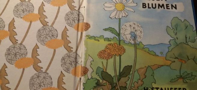 Meine Mutter hat mir schon vor einiger Zeit diese hübschen, kleinen Büchlein geschenkt. Sie hatte sie selber als Kind bekommen. Für heutige Verhältnisse sind sie sehr einfach gehalten, aber in den 50ern gab es noch nicht viele Bücher für Kinder. Und ich oder / und meine Geschwister haben auch unsere Spuren in den Büchlein hinterlassen. Außerdem sie sind so liebevoll getextet und vor allen Dingen die Grafik hat es mir angetan. Mal sehen, ob ich diese feine Pusteblume hinbekomme.