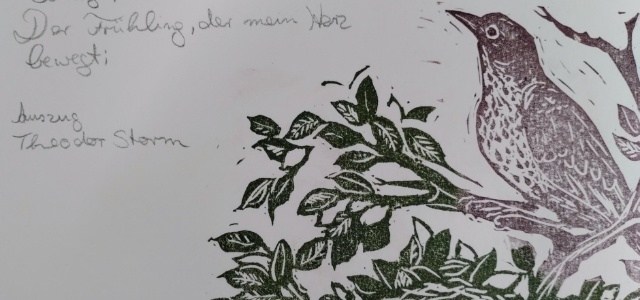 Auf den hiesigen Obstwiesen fand ich erste Ernte für Gelee und Mus und genoß die Natur. Weniger geschnitzt und dergleichen habe ich, auch wurde das Projekt von Michaela und Susanne mit den wöchentlichen Themen zur Gestaltung der Postkarten noch nicht gezeigt, wie ich es wollte. Nicht jede Anregung zur Gestaltung von Karten könnte umgesetzt werden. Der neue „Monatsvogel“ war erst einmal wichtiger (und vorher war ja Schonung angesagt). Weitere Milchtütendrucke müssten auch warten. Aber einen schönen großen „Linocut“ habe ich zum Ende des Monats fertig gestellt, den möchte ich noch extra zeigen. Ach, am Liebsten würde ich gerade alles gleichzeitig machen. Ihr auch?