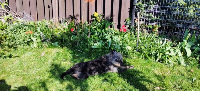 Es wird auch schnell die Gartenschürze ungebunden und der Bärlauch, welcher versehentlich mit Wurzel raus gezogen wurde, eingepflanzt. 3 Minuten Sonne wollen genutzt werden. Dicke Wolken wehen heran und kündigen schon wieder Regen an. Die Sauerkirsche (letztes Jahr erst ganz klein gepflanzt) steht kurz vor der Blüte. Waldmeister, Bärlauch, Tulpen, Schwertlilien und mehr seht Ihr noch im Beet. Funkien kommen auch schon aus der Erde.