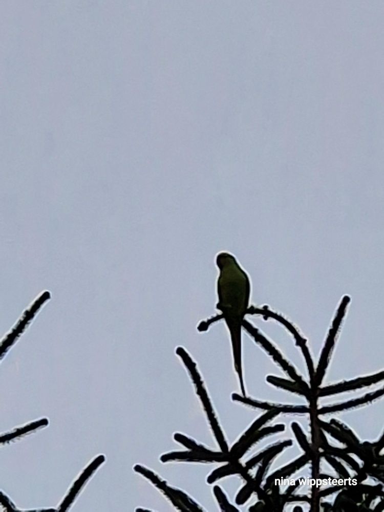 Ich möchte einige Blätter für Tee trocknen, schwarze Johannisbeere aus dem Garten. Gegenüber schaut ein Halsbandsittich, warum bei den Nachbarn die Elstern schimpfen.