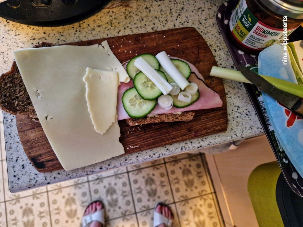 Und gegen den späten Hunger wird ein gut belegtes Brot gemacht, lecker. Noch mal schauen, ob ich gießen muss, aber heute war es nicht so heiß (ein sehr angenehmer Sommertag). Eine dicke Hummel befruchtet netterweise gerade die Gurken.