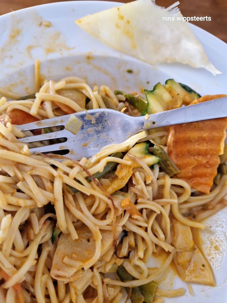 Ich hab daheim noch ein paar Bratkartoffeln, ich hole mir ausnahmsweise noch etwas dazu (die Kokosmilch, die drin sein soll schmeckt man nicht und beim Weißkohl haben sie gern die harten Blätter genommen, werde nicht nochmal dort was holen)