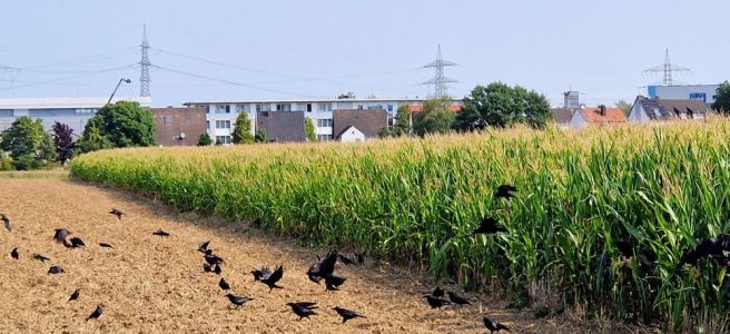 Die Rabenkrähen hocken frech im Mais, mein Anhalten scheucht sie auf