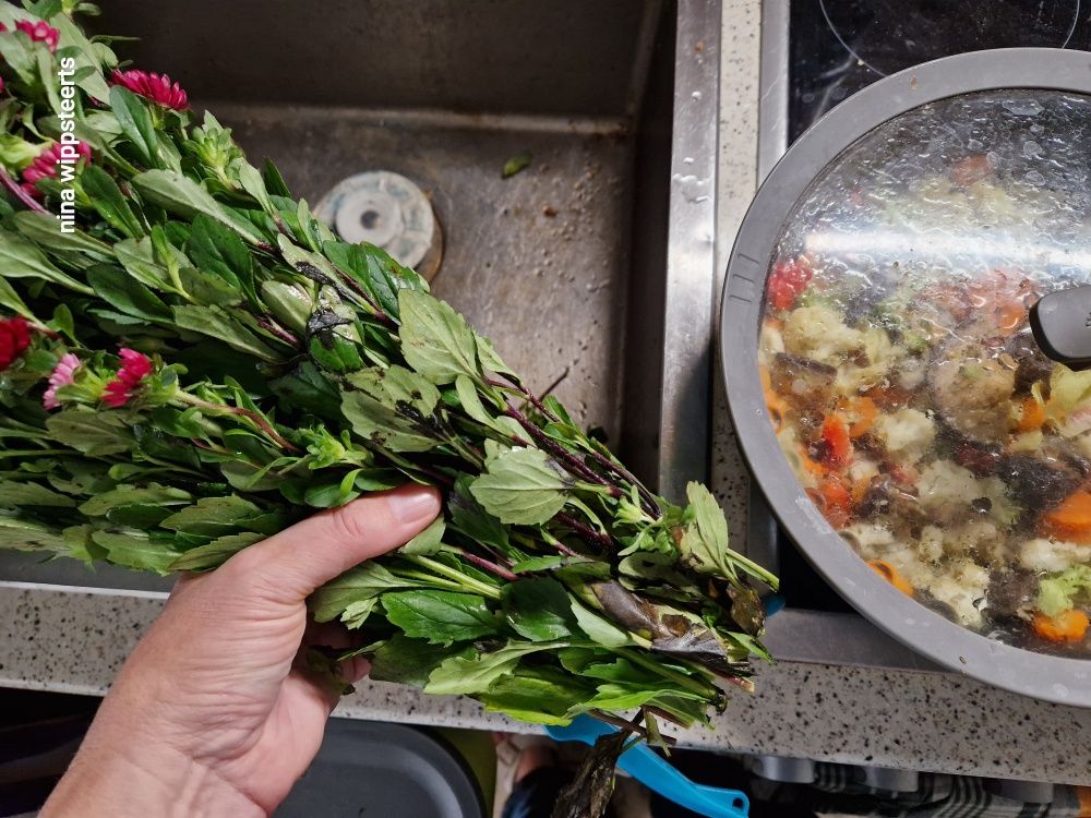Mittagessen (das Pfannengemüse sehr Ihr hier) machen und Stängel der Astern einkürzen und von Blättern befreien.