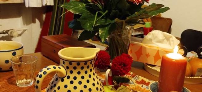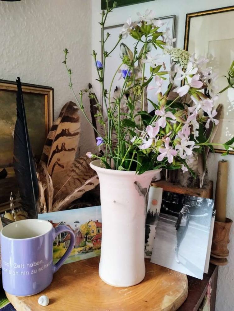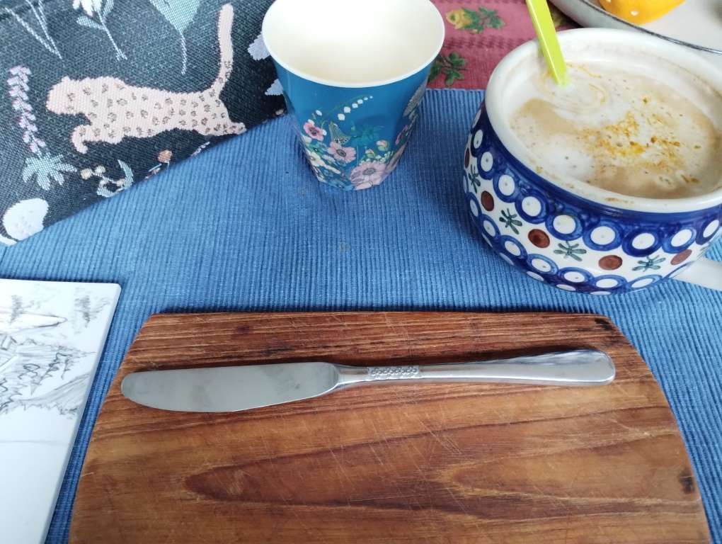 Richtig frühstücken tue ich eh immer später, nur einen großen Milchkaffeepot gibt es immer. Mir ist auch gerade nicht nach Frühstück. Also erstmal Kommentare beantworten und aufräumen und was mich immer erdet, ist ein wenig schnitzen. Weit komme ich damit nicht, eigentlich ist dafür nämlich keine Zeit.