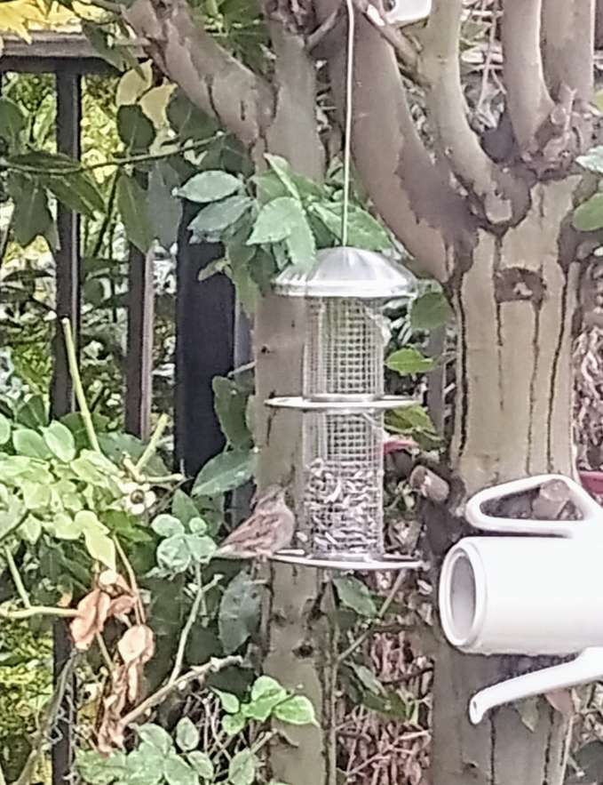 Beim zweiten Kaffee habe ich gerade Glück. Ihren Ruf hatte ich schon gehört und dann saß sie an der Futtersäule. Die Kohlmeisen und Amseln kamen auch vorbei.