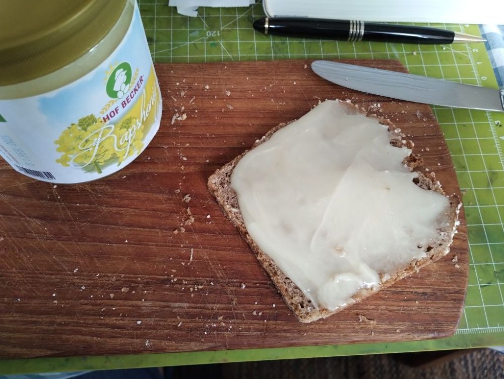 Fix eine kurze Dusche. Dann mag ich zwischen zwei Buchdeckel schauen. Eigentlich wollte ich auch noch Trockenhandtücher bedrucken, aber gerade bin ich etwas unlustig… Eine Paprika habe ich vergessen (und gerade keinen Platz für den Starkzehrer, Mal schauen) und die selbstgezogenen, maltesischen Zitronen brauchen was zum Einpflanzen. Die Süßkartoffel bekommt gleich noch einen Pflanzsack. Etwas gedüngt habe ich auch und die Neupflanzungen haben Wolle mit in den Boden bekommen. Alles kurz angießen. Die kommende Woche soll Regen bringen, daher muss ich heute die Zeit und das Traumwetter nutzen. Linoldrucken kann ich besser bei Regen.