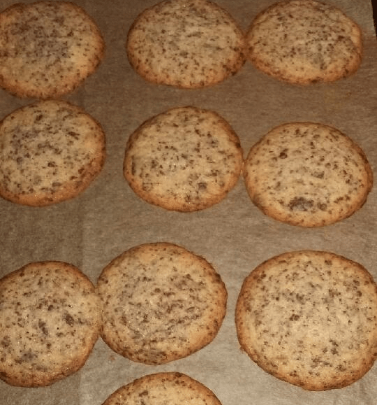 Nun das Blech auf mittlerer Schiene, bzw die Bleche (bei Umluft ca 10°C weniger), 8-10 min lang backen. Die Mitte des Cookies sollte noch weich sein! Auf dem Blech erkalten lassen und dann in Dosen zu Türmen gestapelt verwahren.