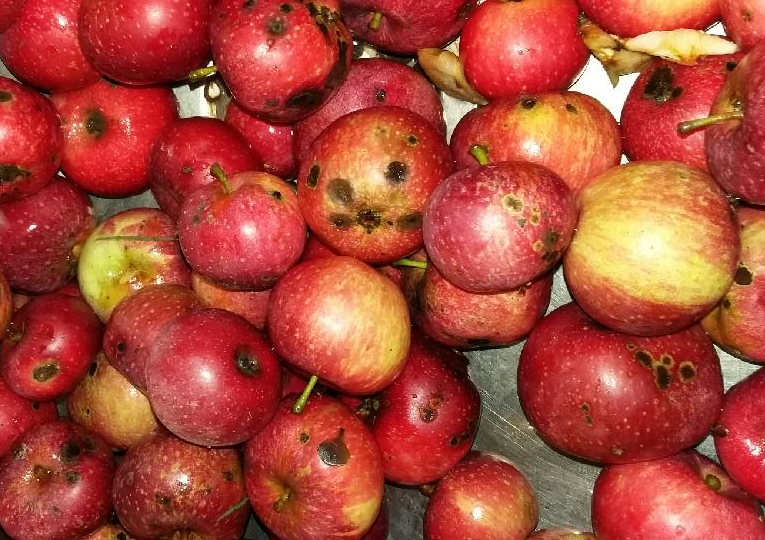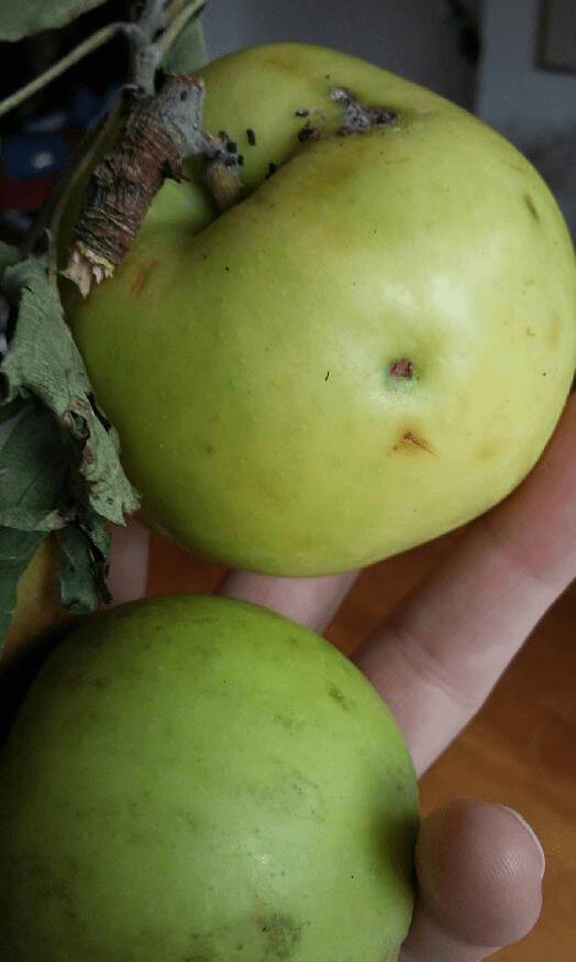 Wie man sieht, ist dies Fallobst durch Würmer und starken Wind. Denn eigentlich bleibt der *Weihnachtsapfel* noch etwas hängen. Seine Erntezeit geht von Oktober bis in den Dezember. Da die Sorte aber windanfällig ist, bekommen wir schon im Altweibersommer erste Früchte.