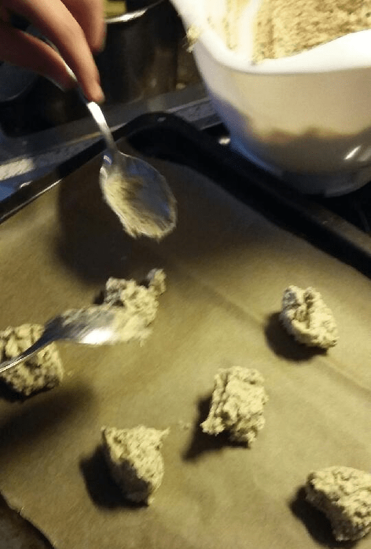 Die Schokolade klein hacken und bei Seite stellen. Unter das Buttergemisch nun die Eier, Mehl und Backpulver rühren. Zum Schluss erst die gehackte Schokolade unterrühren. Wer die Cookies noch schokoladiger mag, der rührt etwa einen El echten Kakao noch unter. Nun mit zwei Esslöffel den Teig auf vorbereitete Backbleche verteilen. (Mit einem kleinen Eislöffel geht das übrigens auch recht gut.)