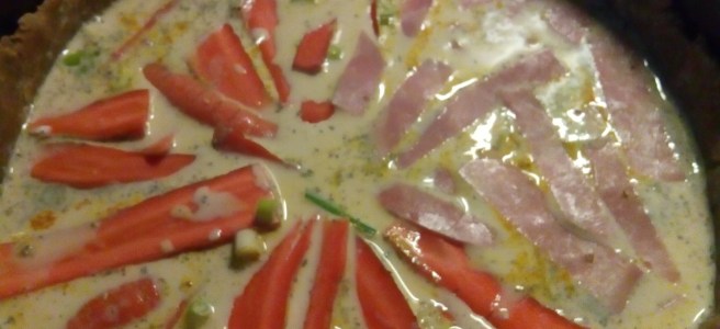 Für die Füllung: 200 ml Schmand, 100 ml Milch, 2 Eier, 100 – 150 g Gorgonzola (oder einen anderen würzigen Käse), Schinkenwürfel gut verrühren. Gemüse nach Wahl aussuchen. Ich habe Karotten und Kohlrabi genommen, diese mit dem Sparschäler in dünne Streifen geschnitten und auch kleine Würfel geschnipselt. Wer es vegetarisch möchte, kann die Schinkenwürfel übrigens gut mit getrockneten Oliven oder Tomaten ersetzen, das ganze bekommt dann eine mediterrane Note (und ich würde auch etwas Oregano hinzu geben). Dann habe ich mit Salz, Pfeffer und Muskatabrieb gewürzt. Seid mit dem Salt etwas sparsam, die Schinkenwürfel geben ja auch *ihren Teil ab*.