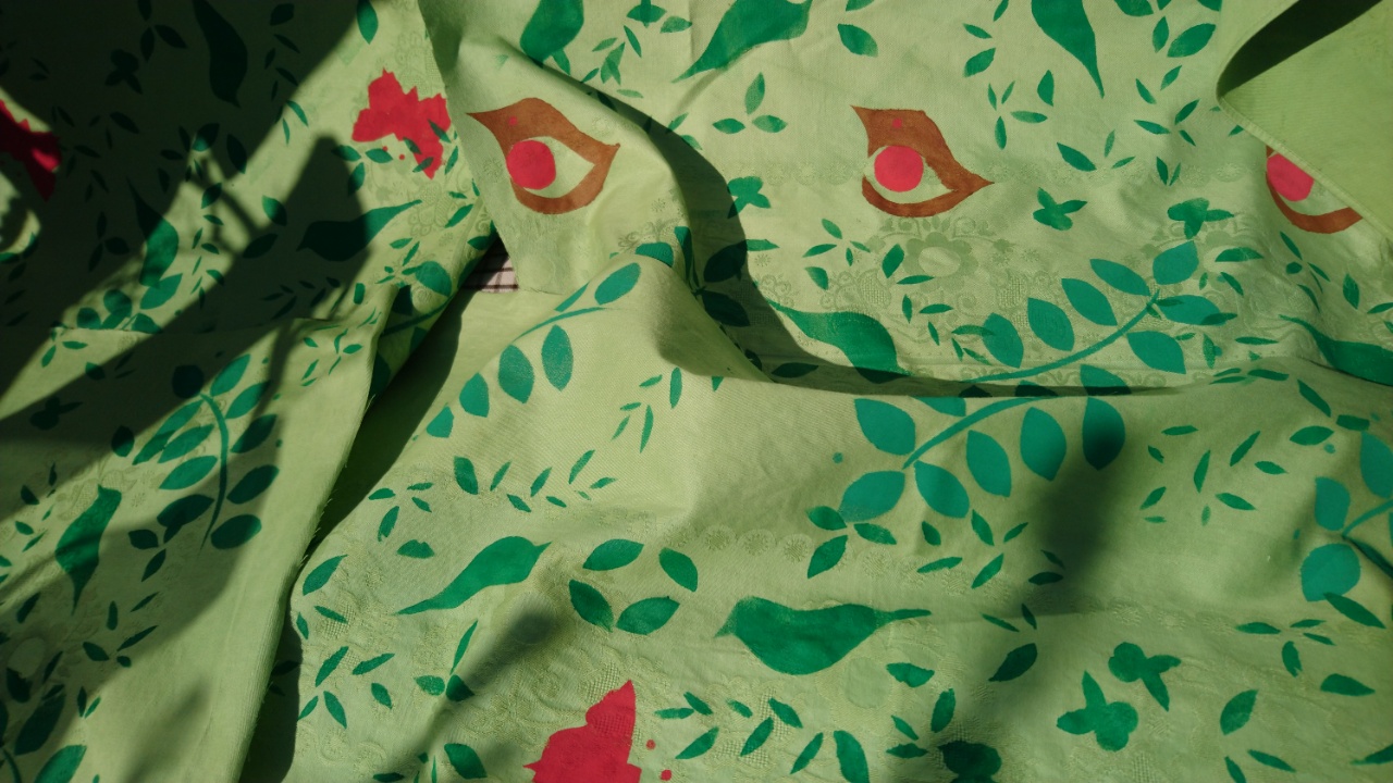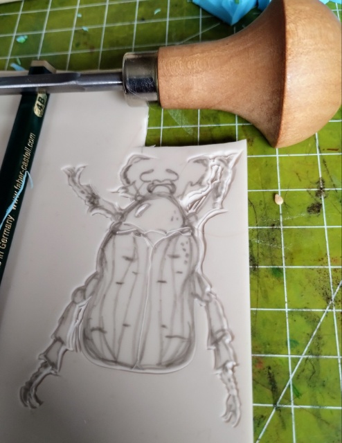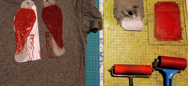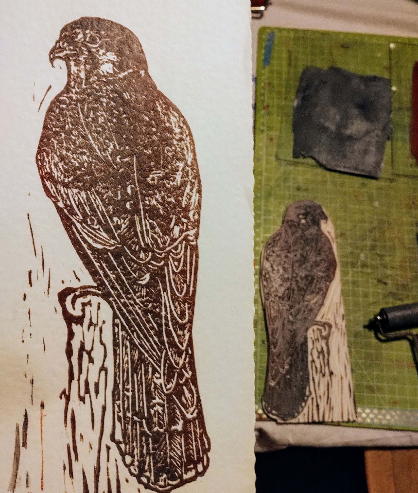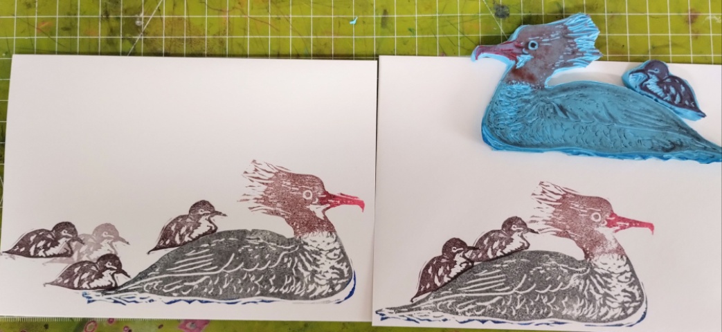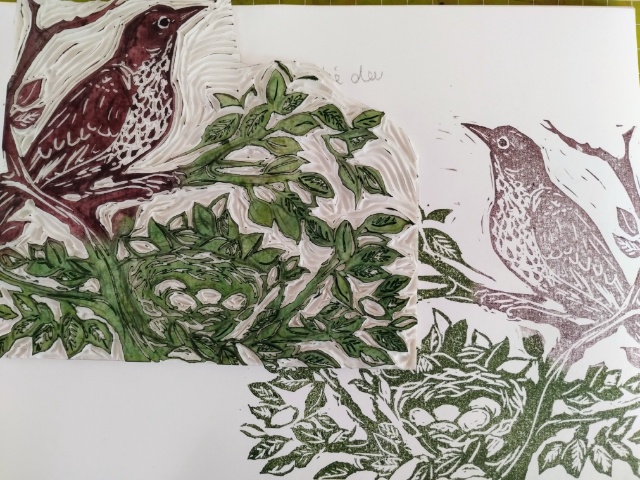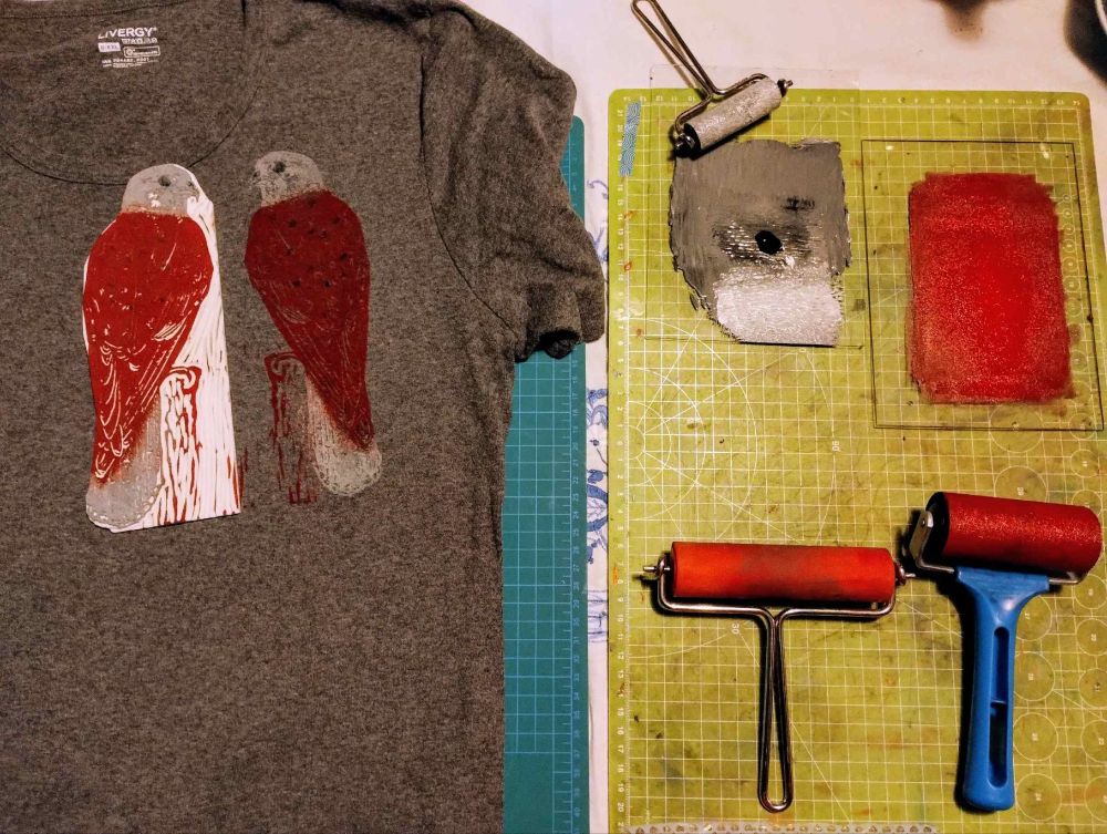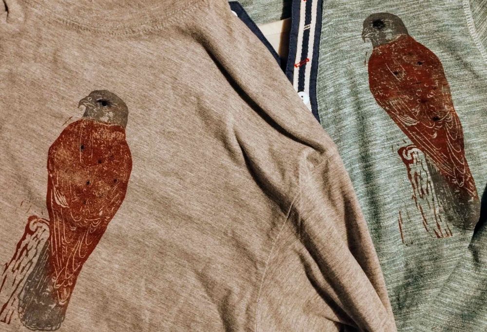 Zu Weihnachten gab es hier noch (Bingo, auf die letzte Minute und Upcycling und Weihnachtsgeschenk) bedruckte Shirts und alte Geschirr Tücher mit dem Göttervogel. Zwar hatte ich den Vogel schon am 2. Adventswochenende fertig geschnitzt, aber das Drucken ohne gesehen zu werden, gestaltete sich schwierig.