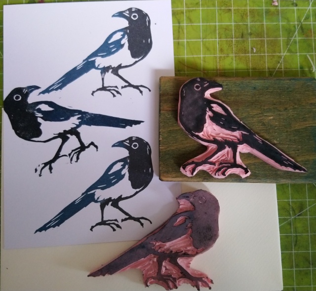 Letztens ist mein Blog ein Jahr älter geworden. Und weil ich ohne Euch viel weniger davon hätte und nur vor mich hin schreiben würde, ganz zu schweigen von dem Austausch mit Euch, werde ich mal etwas Kleines verlosen. Passenderweise zum Jahresprojekt *Flatterhaft* gibt es natürlich einen Vogel Stempel, eine Elster. Gestern Abend hab ich meine oben genannte kreative Unlust bei Seite geschoben.