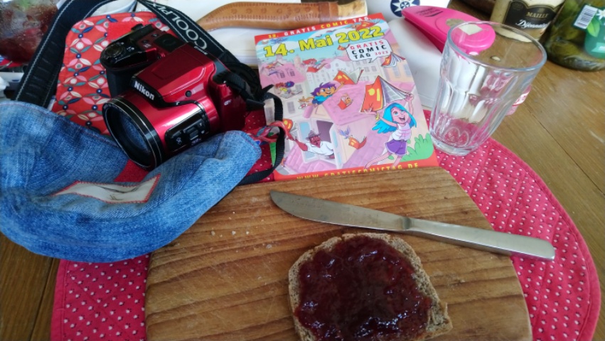 Vom Hundegang ist die wunderbare Kastanienblüte, darunter und dabei Sammelsurium aus dem Garten (und der Strauß als Gesamtbild wird noch beim Flower Friday gezeigt werden) So kurz eine Iris auch nur blüht, es ist eine wahre Pracht. Die Meisen im Kasten dahinter scheinen ausgeflogen zu sein. Ich höre sie im Nachbargarten (oh weh, mit Katzen). Im Holunder hier werden die Blaumeisen gefüttert. Erwischt. Auf der Baumspitze schräg gegenüber zwitschert seit Tagen unermüdlich die Mönchsgrasmücke. Das Heranholen ging nur mit der richtigen Kamera, in zweifacher Hinsicht (deren Übertragungskabel gerade fehlt). Endlich Frühstück. Dauert bei mir immer etwas, bis ich essen mag. Wie Ihr seht, am 14. ist Gratis Comic Tag, schaut mal, ob Eure Buchhandlung auch mit macht (bei Interesse). Ein elektrisches Dingsbums hat gestern Einzug gehalten. Gegen unliebsame Insekten im Haus manchmal wirklich gut, allein von der Reichweite her. Gießen, gießen gießen