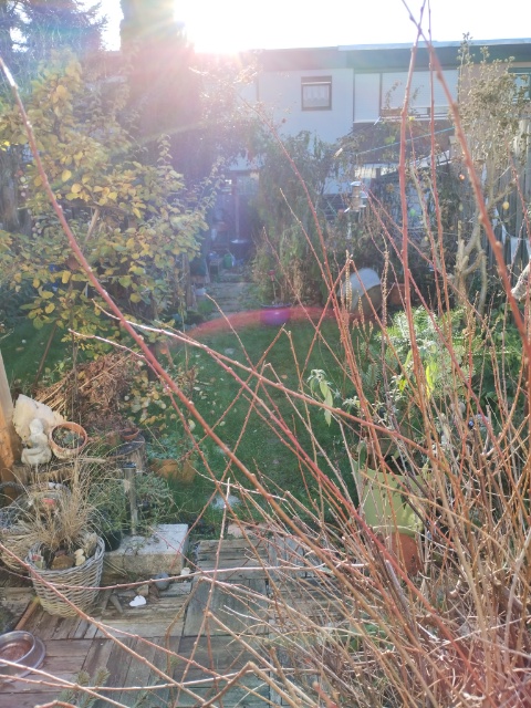 Ach, die Sonne lässt die Spinnenfäden hell tanzen, auf dem Foto sind es dann die Lichtreflexionen. Es ist kalt und schön draußen. So viel angenehmer und schöner und richtig Winter. Bis letzte Woche hat hinten am Rosenbogen noch die wilde Tomate gewuchert und geblüht. (nicht, dass wir eine Tomate davon hätte essen können, alle blieben grün, aber wunderschön war sie)