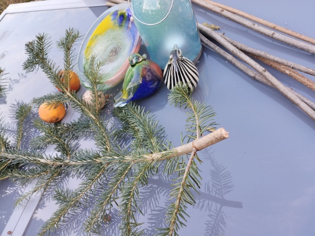 Ein wenig Vogelfutter auf dem Tisch. Die Stöcke sind noch vom Marshmallowgrillen am Feuerchen.