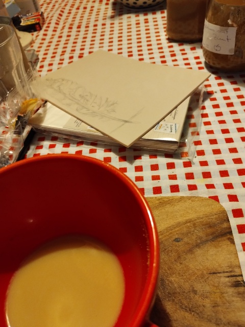 Zweiter Milchkaffee (zZt immer ohne Koffein), Frühstücksbrot und später muss ich noch zusehen, dass ich die Skizze schnitze – oder zumindest anfange.