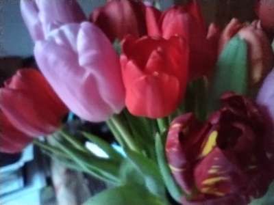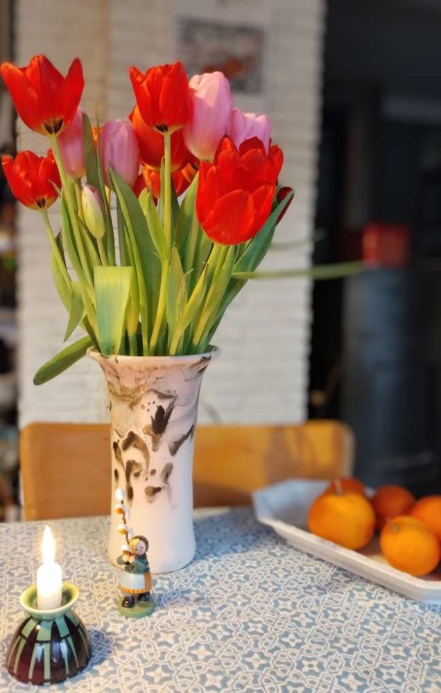 Meine Nelken, noch mal frisch angeschnitten, blühen immer noch. Aus dem Nachbargarten durfte ich ein kleines Sträußchen mitnehmen. Meine rote, noch kleine Pfingstrose geht aber auch gerade auf.