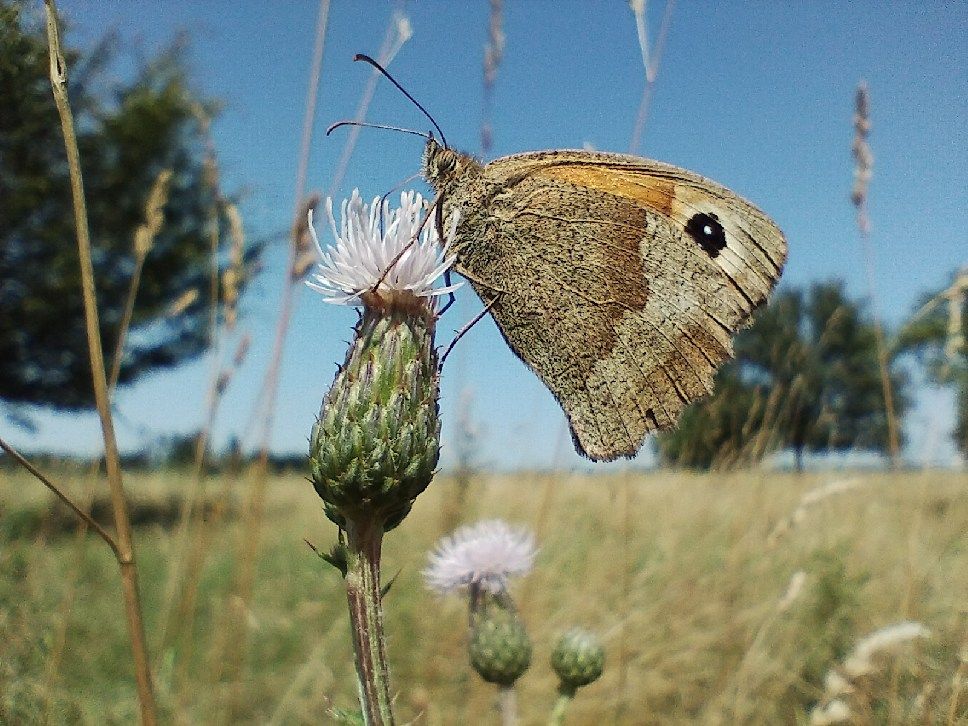 Vögel sind kaum zu hören, ein Bussard schreit im kleinen Wäldchen ein Feld weiter und ein Rotkehlchen schimpfte kurz im Gestrüpp. Der August ist „Urlaubszeit“ für Vögel, die Mauser ist definitiv im Gange. Vereinzelt hörte ich das Pipen der letzten jungen Amseln. Manchmal bekommen sie immer noch den ein oder anderen Wurm von den Eltern, obwohl sie schon fliegen können und selber suchen.