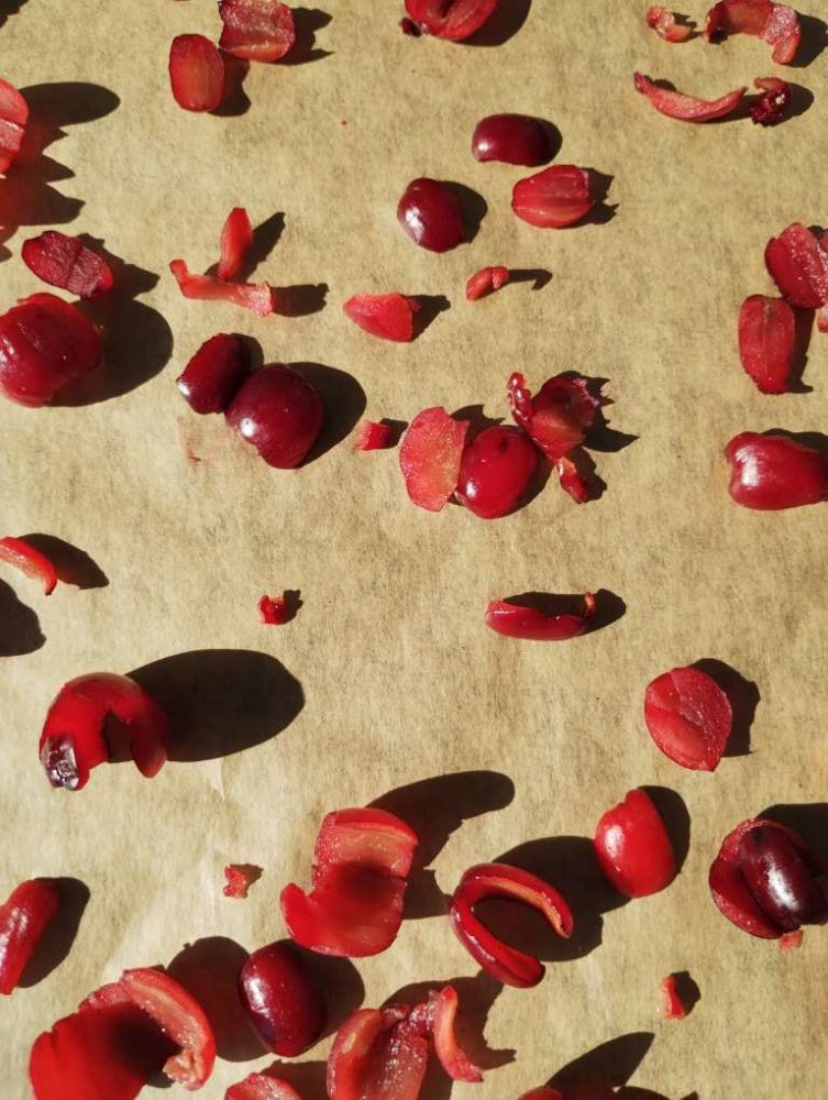 Etwas umständlich herzustellen sind Trockenfrüchte. Dazu müsst Ihr nämlich das Fruchtfleisch mit einem kleinen Messer vom Kern schneiden. Kein Kirschkern Entsteiner oder ähnliches hilft da. Ich habe mir die Kerne nach dem Trennen immer noch in den Mund gesteckt, zum Ablutschen. 😊 wenn Ihr keinen Dörrautomaten habt, hilft Euch gerade auch die Sonne beim Trocknen. Ansonsten geht das im Backofen.