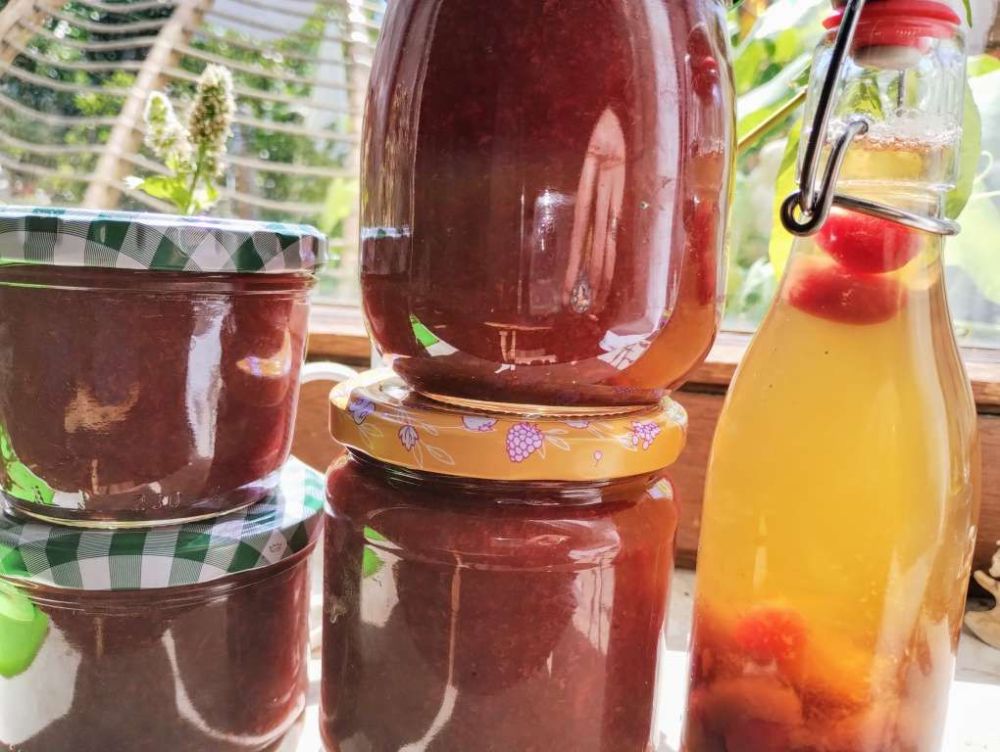 Ich habe einiges an Fallobst an dem Tag gefunden, Wildbirnen und Äpfel. Einmal die „Kirschen“ in einem Topf garen, weich dann durch die Flotte Lotte (oder ein Sieb) und in einem anderen das große Obst (geschält und entkernt natürlich und nach dem Kochen püriert). Gelierzucker entsprechend des Gewichtes/Menge (und Euern Vorlieben) mit allen Früchten zusammen gemischt, aufgekocht und dann verarbeitet in saubere Gläser. Es ist eine relativ zähe Masse, richtig sprudelnd aufkochen konnte ich sie nicht. Aber es ging trotzdem gut.