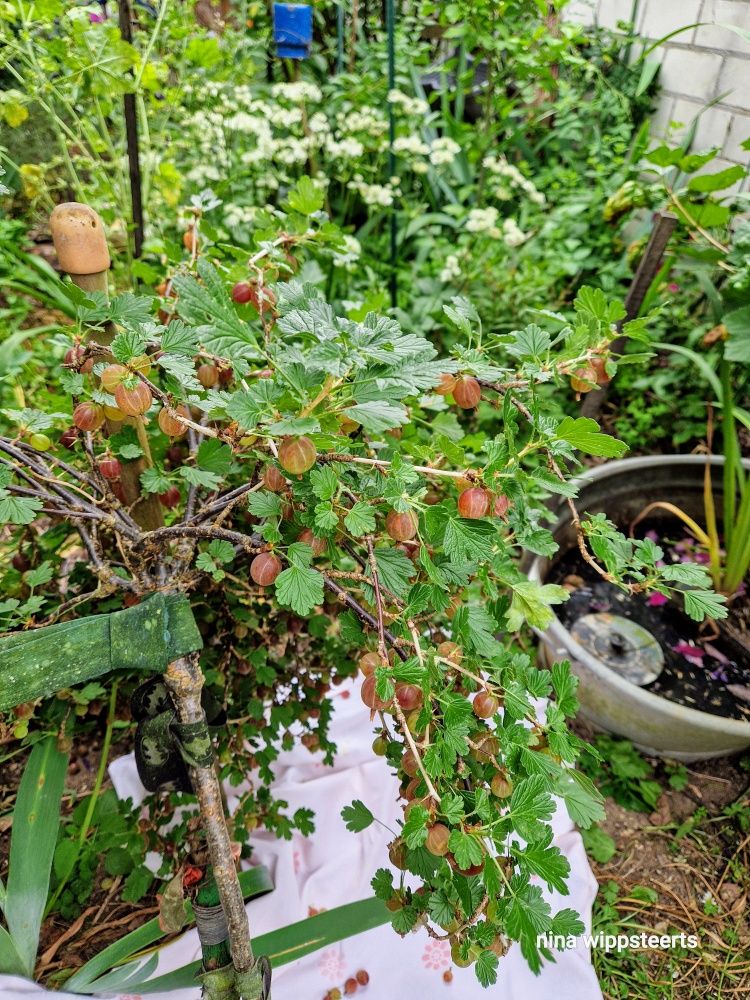 Die Stachelbeeren, die mehr Sonne abbekommen (haben) sind teils so reif, dass sie fallen. Also habe ich eine alte Tischdecke auf dem Boden ausgebreitet und fange an zu ernten. Dieses Jahr sind diese Früchte kleiner, aber nicht weniger stachelig. Im Hintergrund strahlt die Sterndolde.