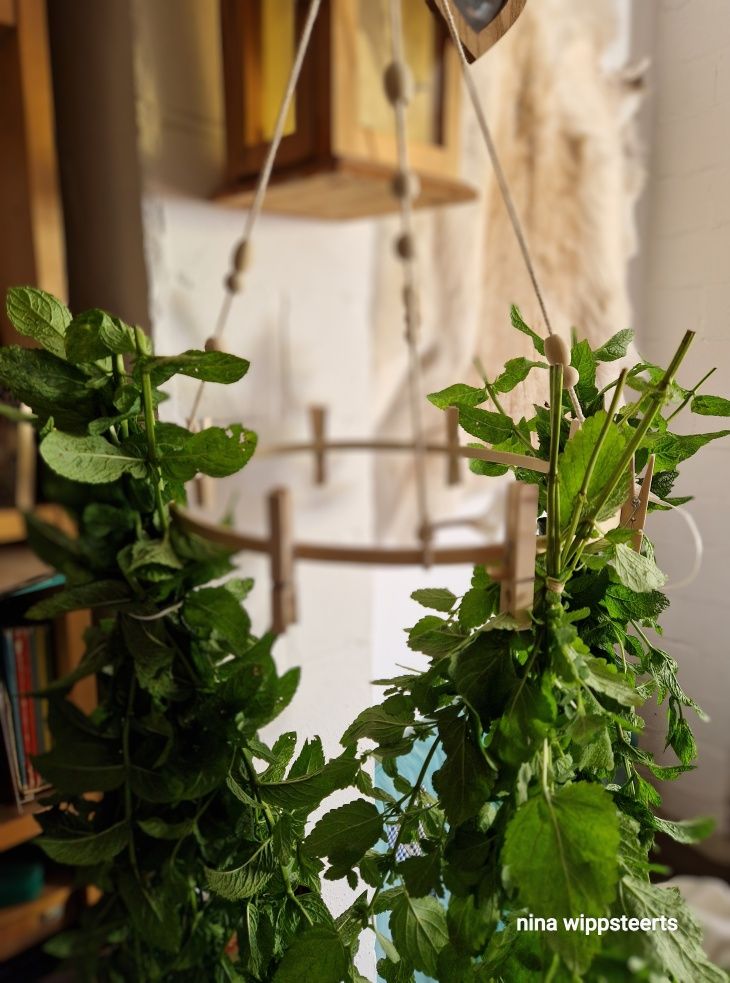 bei minimale Sonneneinstrahlung, damit möglichst viele ätherische Öle in der Minze bleiben, duften die Sträußchen im Wohnzimmer.