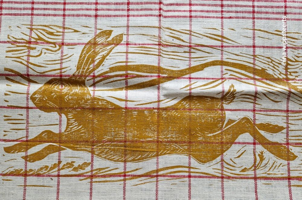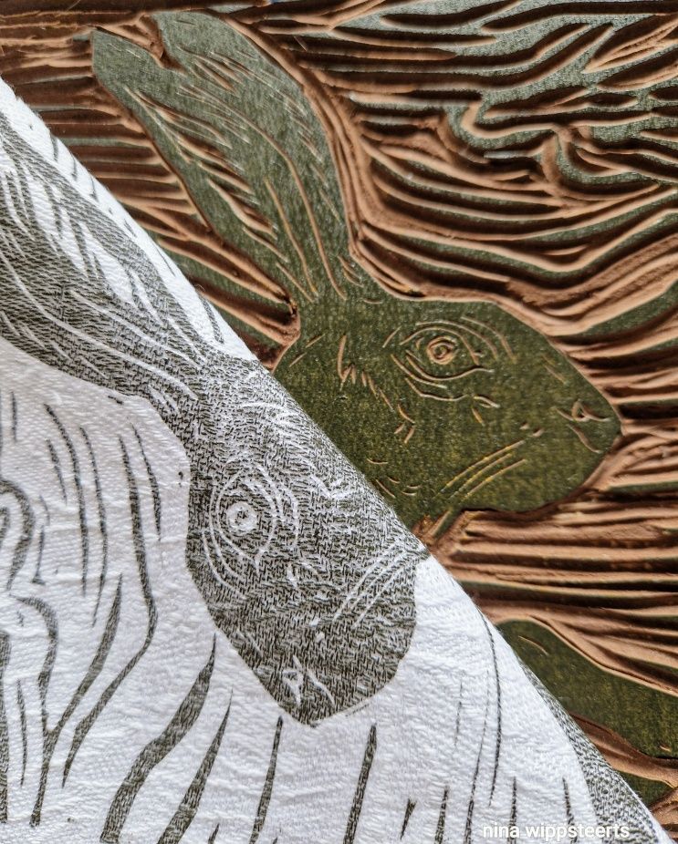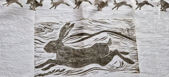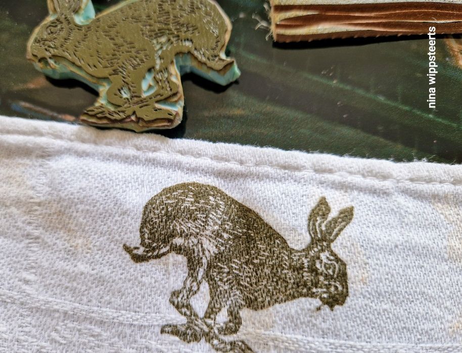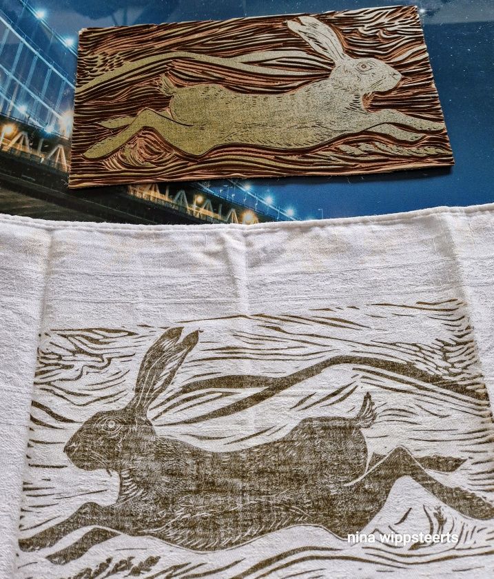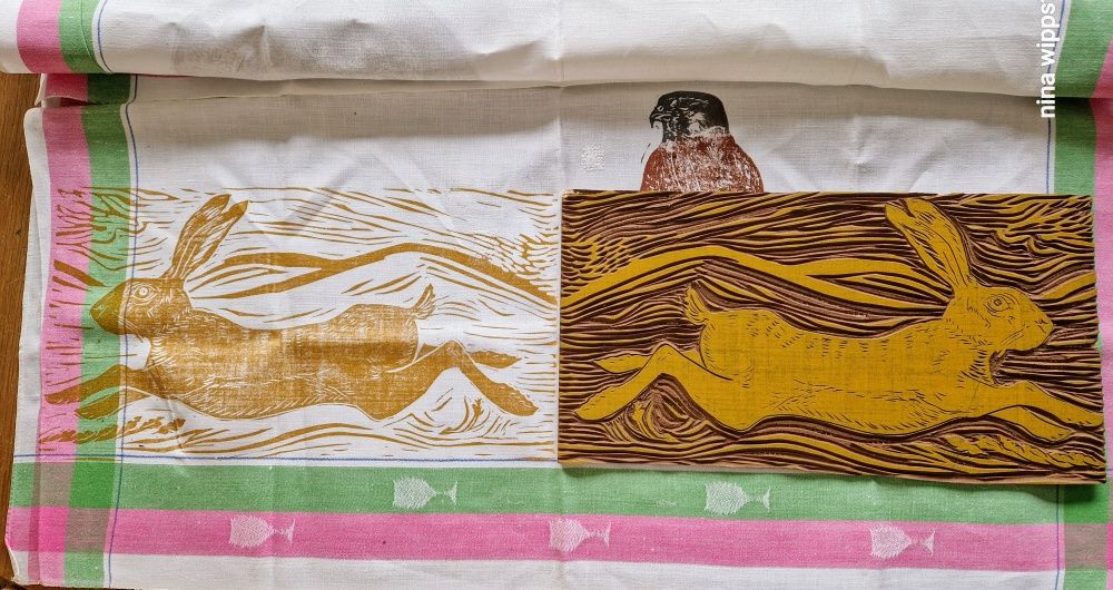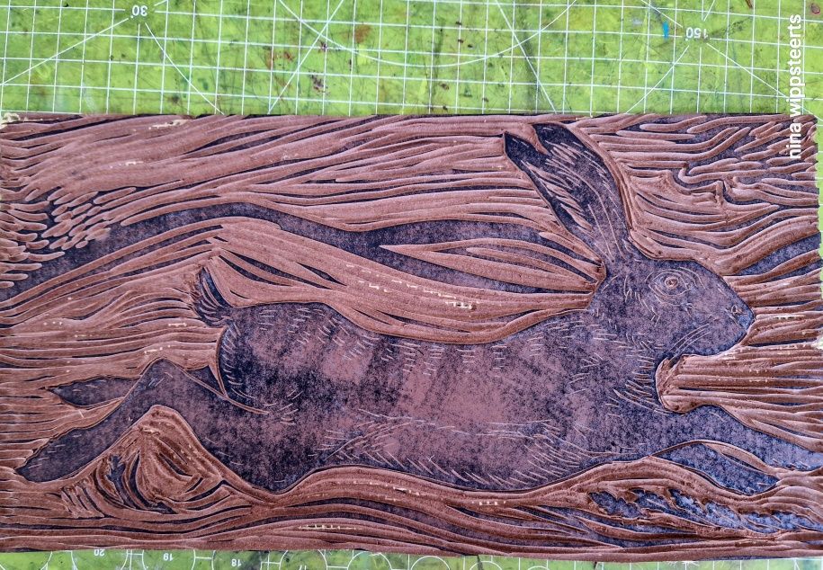 Nun zu dem angekündigten Linoldruck, dem rennenden Hasen. Meist schnitze ich ja in Gummiplatten, aber manche Motive mag ich lieber in klassische Linolplatte schnitzen. Ich glaube nur, diese ist etwas brüchig, die bewußt stehengelassen Stege lösen sich teils. Aber der mit kräftigen Beinen ausholende Hase sollte Bewegung ausstrahlen und etwas stilisierte Wiesen haben.