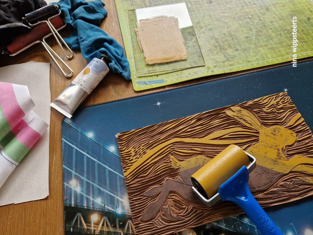 Diese Farbe ist schön zäh und nicht so schnell trocknend. Genau wie es zur Verarbeitung auf der Linolplatte sein sollte!