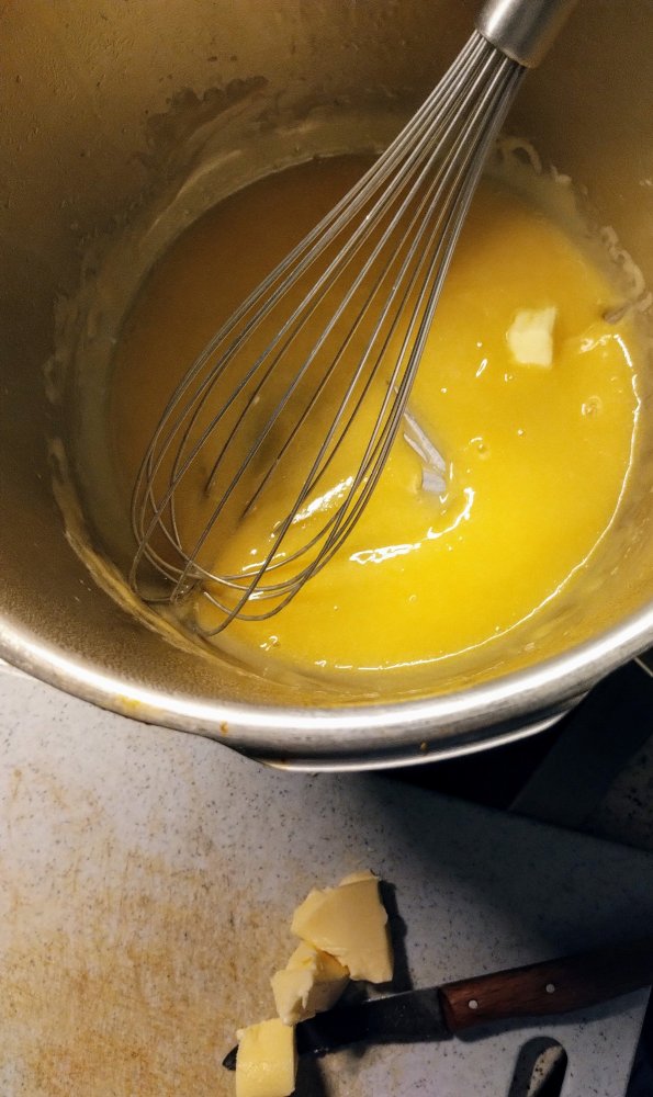 Bitte die Reihenfolge beachten! Zitronensaft und Zucker im Topf aufkochen, immer umrühren. Ei und Eigelbe in einer Rührschüssel mit dem Schneebesen kurz aufschlagen. Nun langsam das Zitronenzuckergemisch in die Eier geben und dabei kräftig schlagen. Die Masse nun zurück in den Topf auf dem Herd stellen und etwa 5min leicht köcheln lassen. Dabei immer weiter rühren. Die Masse wird dabei langsam immer cremiger, diese dann vom Herd stellen und die Butter in Würfel schneiden und nach und nach unterrühren. Es wird eine hellgelbe, glänzende und zähe Masse. Lemon Curd ist mit Frischei und sollte daher auch „relativ zügig“ nach Öffnen gegessen werden und immer im Kühlschrank aufbewahrt werden.