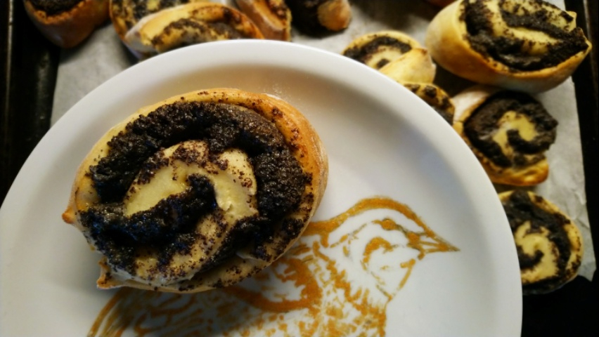 Am Einfachsten ist es immer, die Hälfte des Mehls (schmeckt übrigens auch mit Vollkorn) mit Hefe und Zucker und der warmen Milch anzurühren, damit die Hefe gut aufgehen kann. Das Ei nach dem Aufschlagen an den Rand auf den Hefeteig, dann nimmt es die richtige Temperatur an, einen guten Stich Butter daneben. Den Teig aufgehen lassen, die zweite Hälfte Mehl dazu und gut kneten, wieder gehen lassen. Dann mit etwas Mehl ausrollen. Den Mohnback mit Milch oder Kondensmilch anrühren und auf dem Teig verteilen und zusammenrollen. In Stücke schneiden und in den auf 175 °C vorgeheizten Ofen, mittlere Schiene, nach 15-20 Minuten nachschauen, ob sie schön leicht braun geworden sind (grins) und nach etwas Abkühlung gleich reinbeißen.